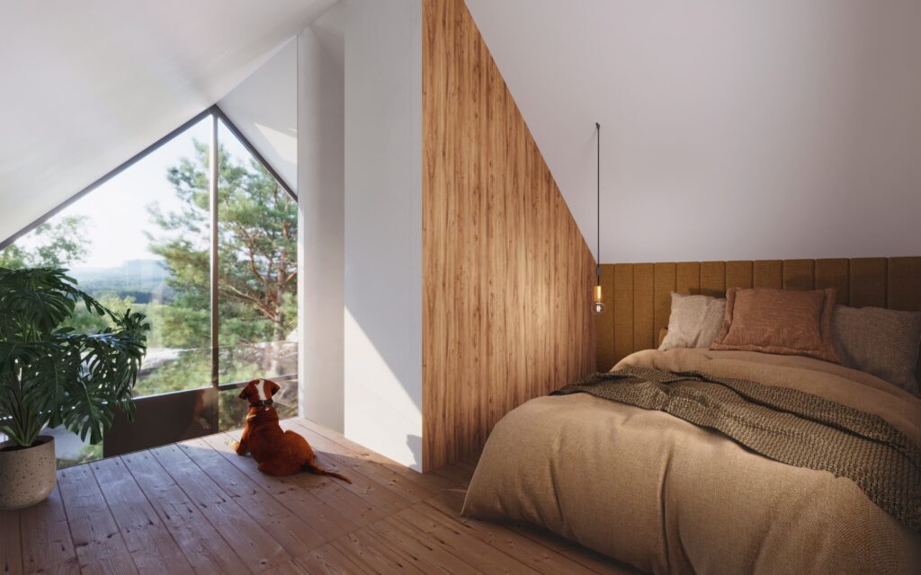 The model includes two bedrooms, a bathroom, and a living room with a kitchenette. The stairs to the loft incorporate smart storage solutions. Orsa is well-suited for small plots and is perfect as a year-round residence, rental unit, or a summer cabin for everyday use.