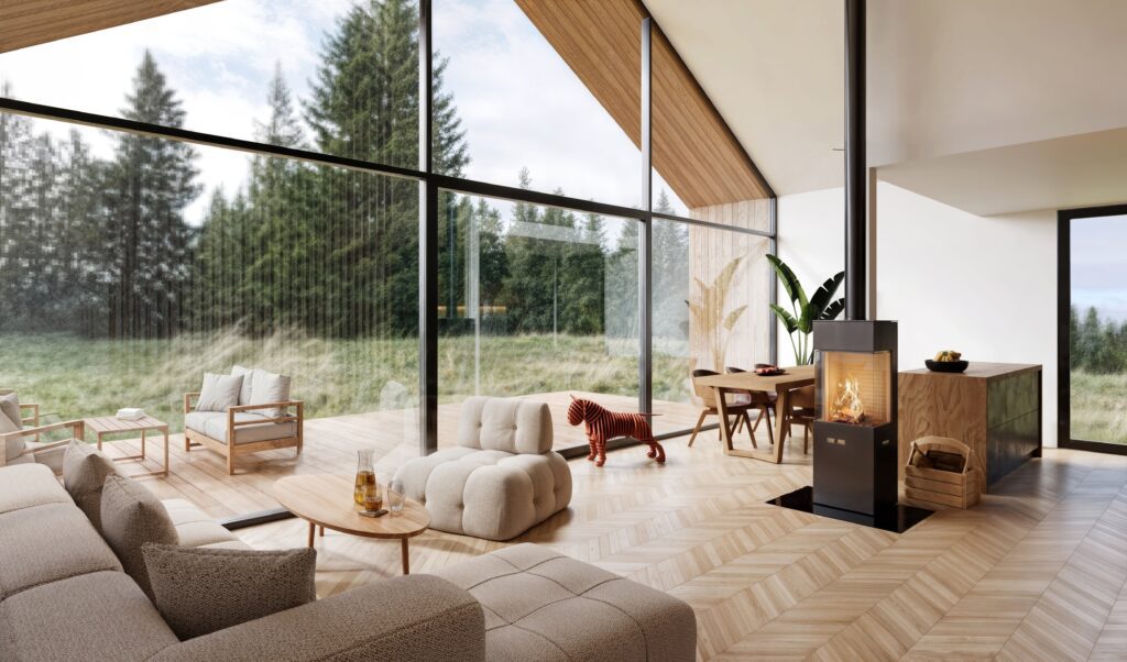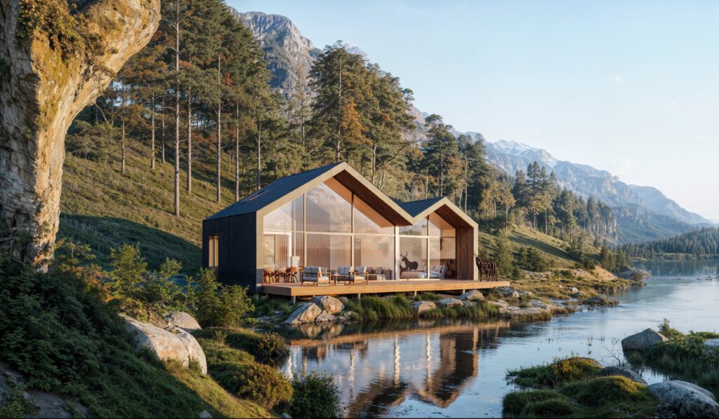 Senja is one of the most spectacular models in our portfolio. Its distinctive double roof and wide façade with large floor-to-ceiling windows create a strong visual impression—especially in scenic surroundings.