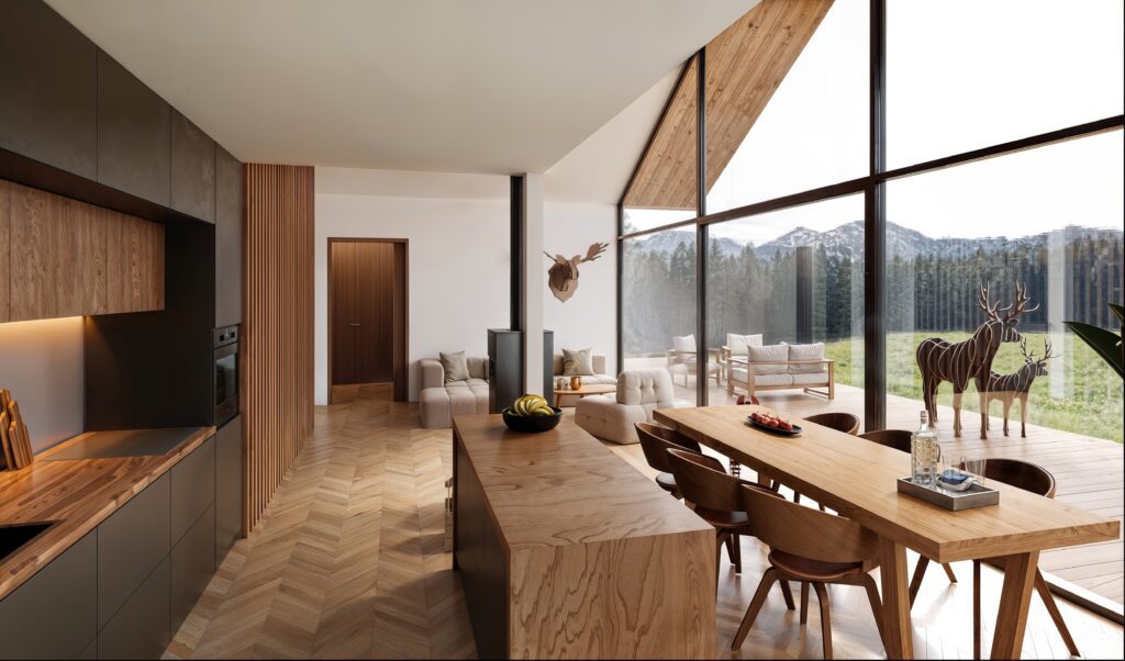 Thanks to the open interior layout and the full width of the building, this 69 m² house feels even more spacious. The living room and kitchen are combined into an impressive open-plan space, perfect for gathering and socializing. An optional layout allows for up to four bedrooms, making this model ideal for families or groups of friends.